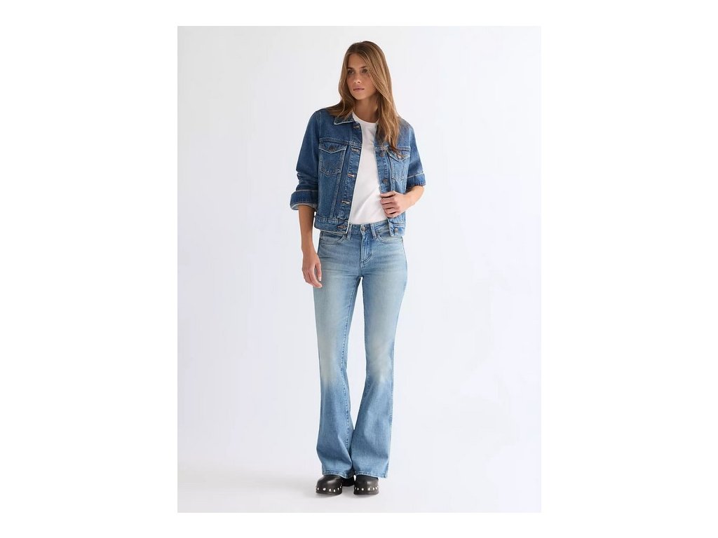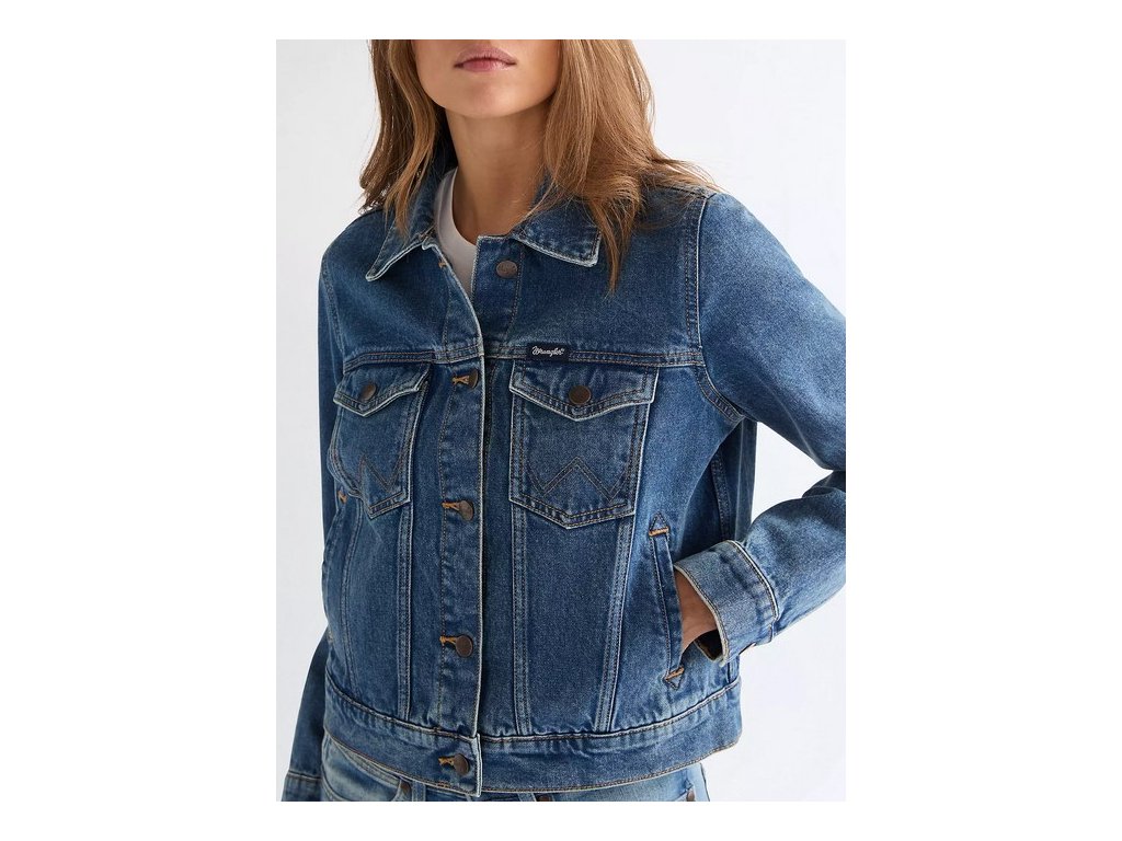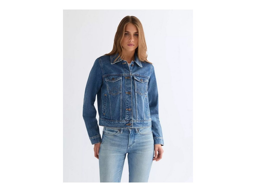 Dámská džínováu bunda značky Wrangler, konkrétně model Wrangler Regular Western Jacket v barevném provedení Frontier Fade je klasickým doplňkem šatníku s nastavitelným lemem a autentickým pevným denimem.
