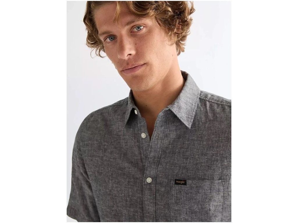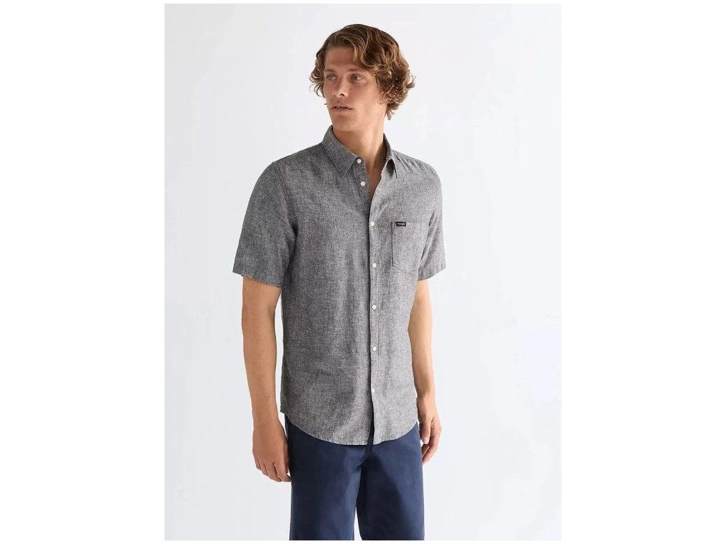 Pánská košile Wrangler SHIRT Dark Navy - odlehčený letní model s krátkým rukávem, který kombinuje bavlnu a len pro maximální prodyšnost.