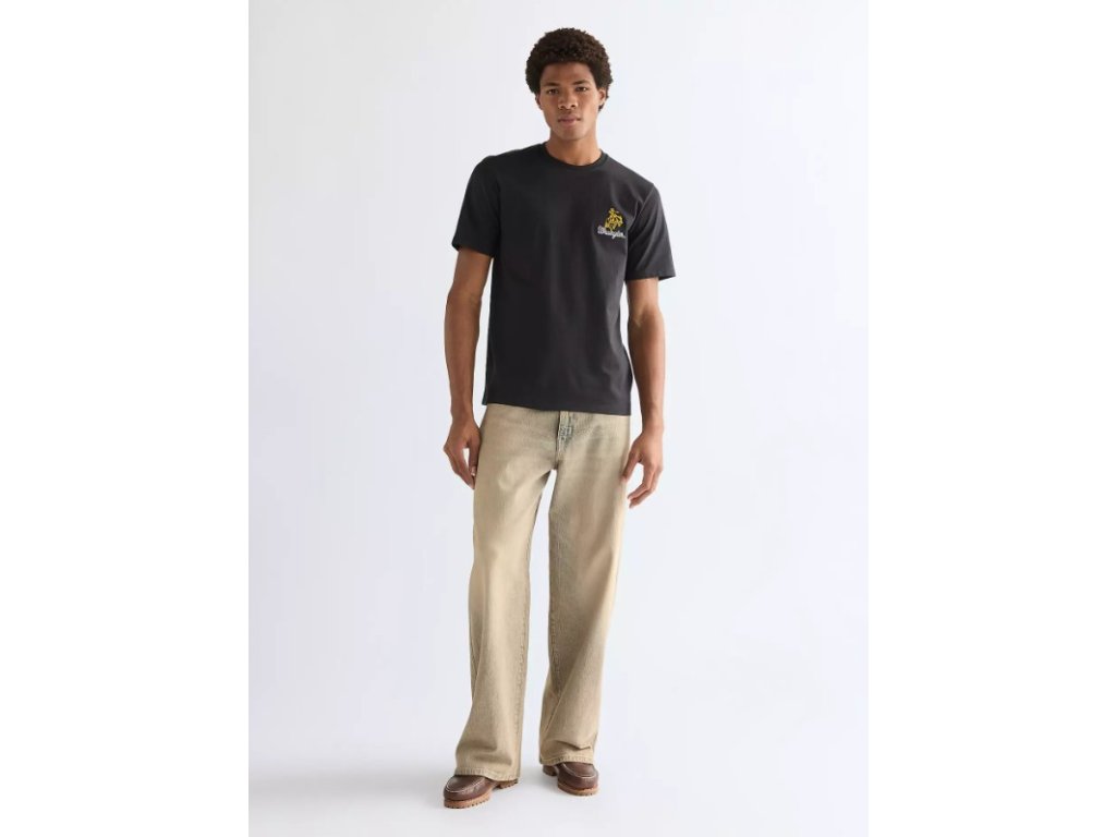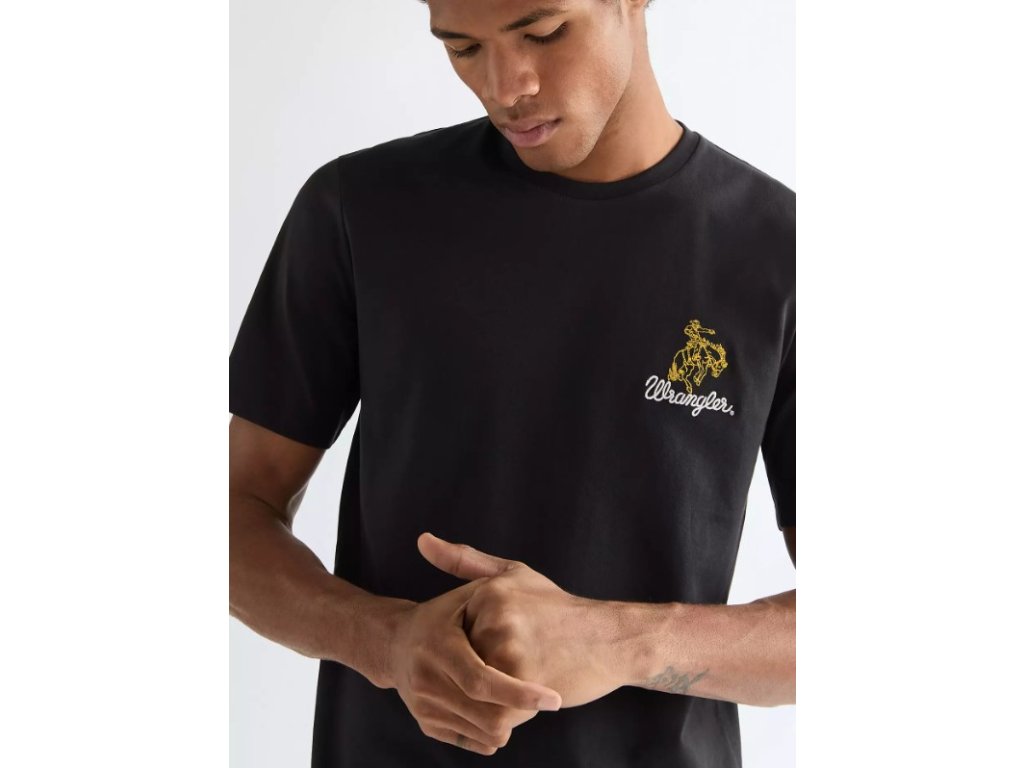Pánské tričko WRANGLER EMBROIDERY TEE BLACK - měkké a vzdušné tričko s výšivkou je vyrobeno z 100% bavlny oslavuje naše západní kořeny decentní rodeovou výšivkou na levé straně hrudi.